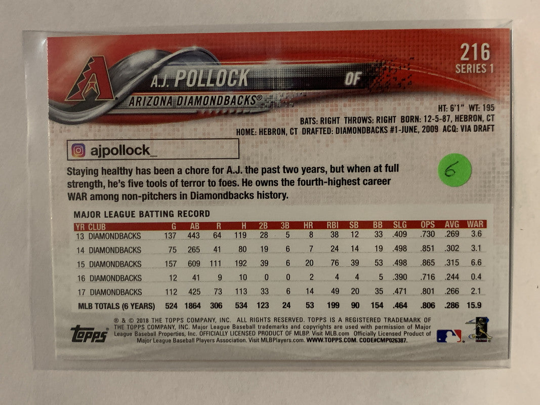 #216 A.J. Pollock Arizona Diamondbacks 2018 Topps Series One Baseball Card MLB