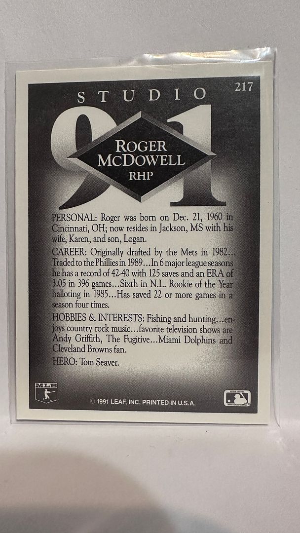 #217 Roger McDowell Philadelphia Phillies 1991 Studio Baseball Card