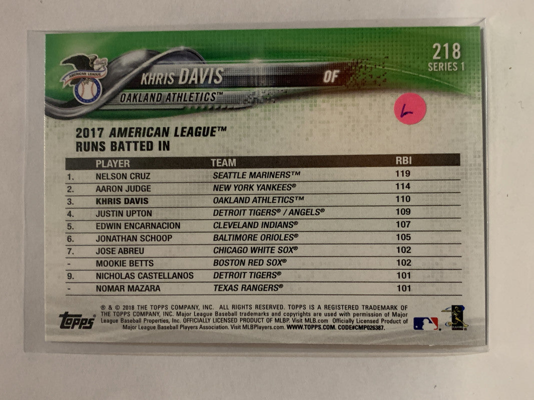 #218 Khris Davis League Leaders Oakland Athletics 2018 Topps Series One Baseball Card MLB