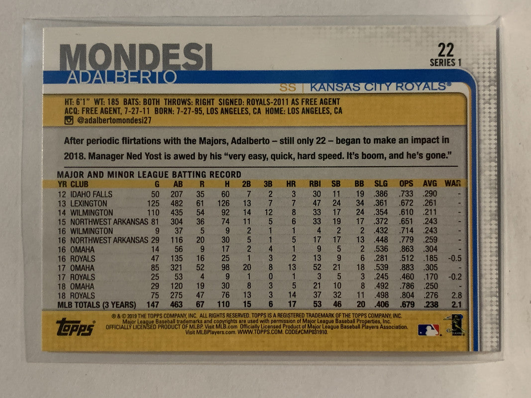 #22 Adalberto Mondesi Kansas City Royals 2019 Topps Series One Baseball Card