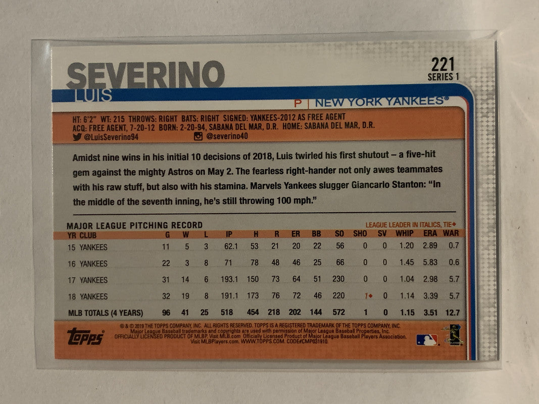 #221 Luis Severino New York Yankees 2019 Topps Series One Baseball Card