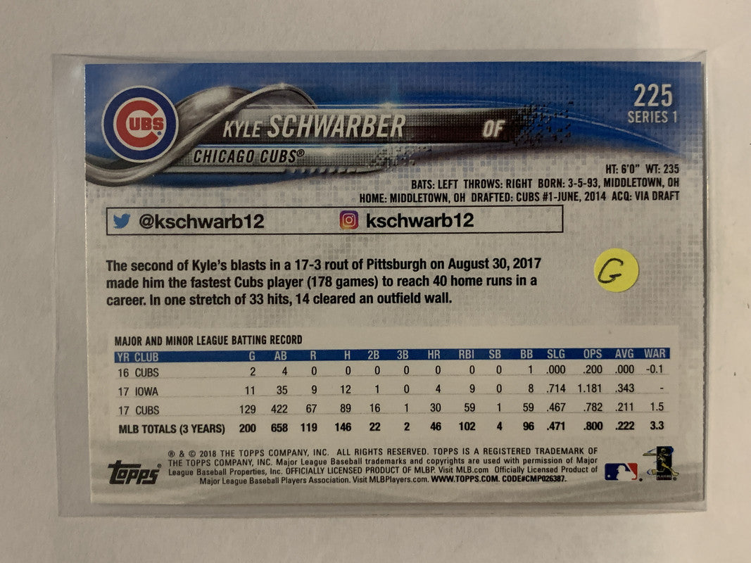 #225 Kyle Schwarber Chicago Cubs 2018 Topps Series One Baseball Card MLB