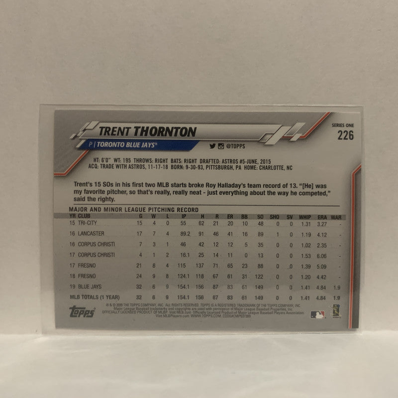 #226 Trent Thornton Toronto Blue Jays 2020 Topps Series One Baseball Card JB