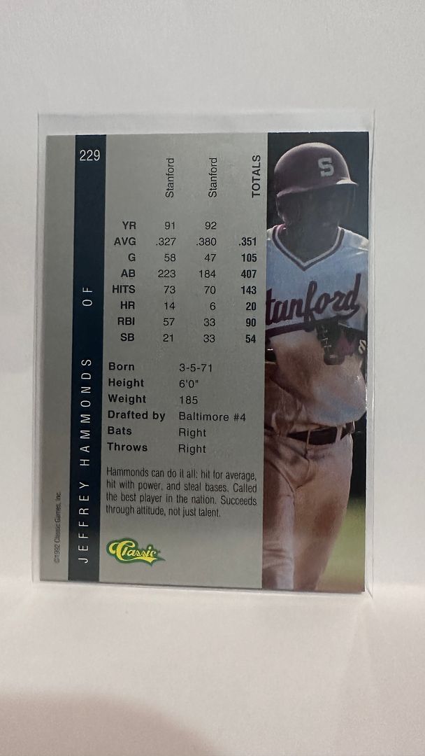 #229 Jeffery Hammonds Draft Pick Baltimore Orioles 1992 Four Sport Classic Baseball Card