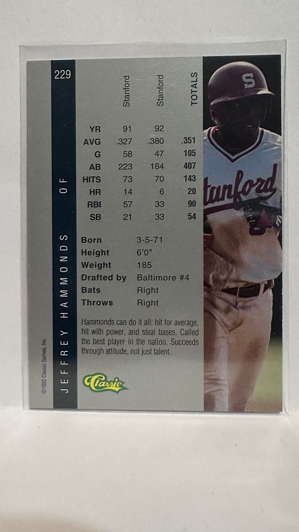 #229 Jeffery Hammonds Draft Pick Baltimore Orioles 1992 Four Sport Classic Baseball Card