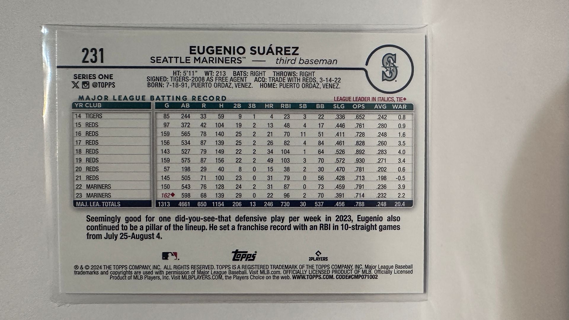 #231 Eugenio Suarez Rainbow Foil Seattle Mariners 2024 Topps Baseball Card