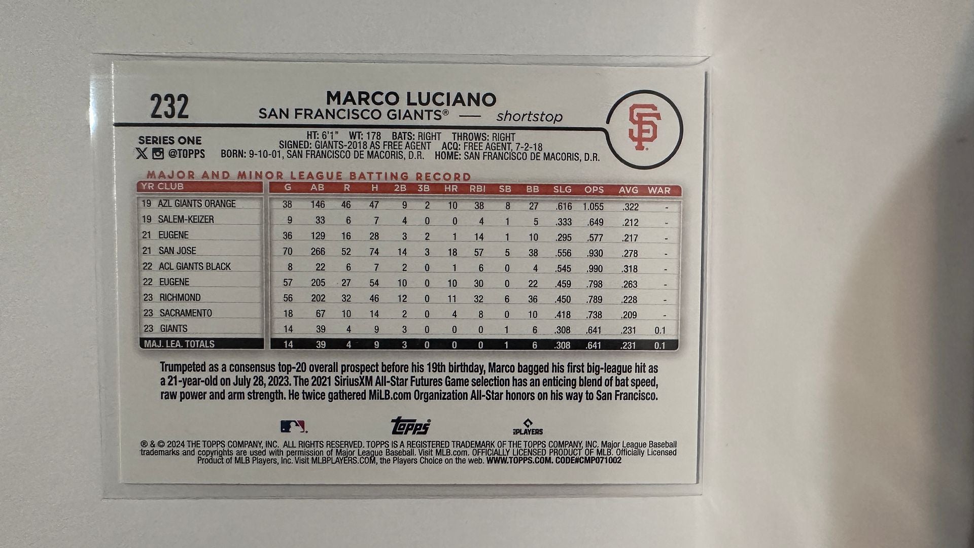 #232 Marco Luciano Rookie San Francisco Giants 2024 Topps Baseball Card