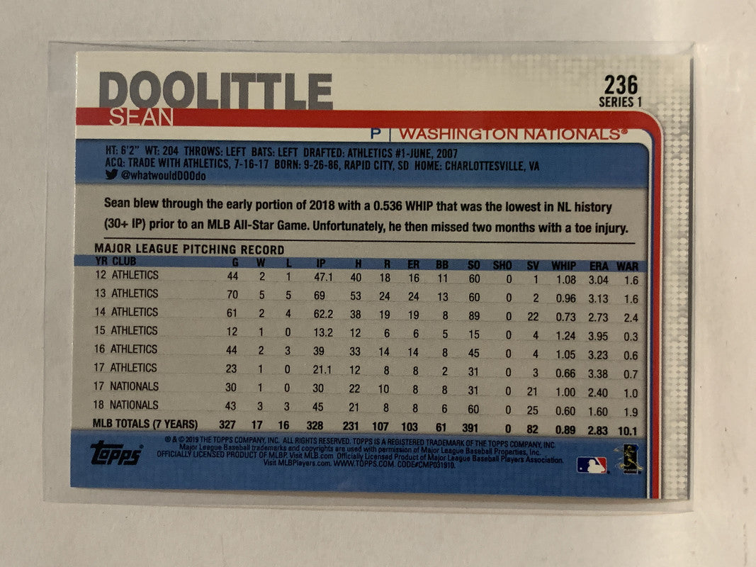 #236 Sean Doolittle Washington Nationals 2019 Topps Series One Baseball Card
