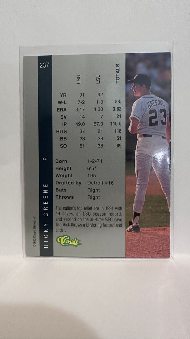 #237 Ricky Greene Draft Pick Detroit Tigers 1992 Four Sport Classic Baseball Card