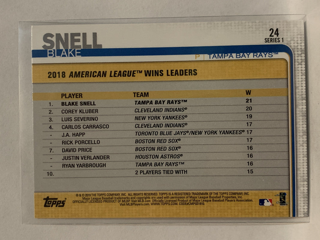 #24 Blake Snell League Leaders Tampa Bay Rays 2019 Topps Series One Baseball Card