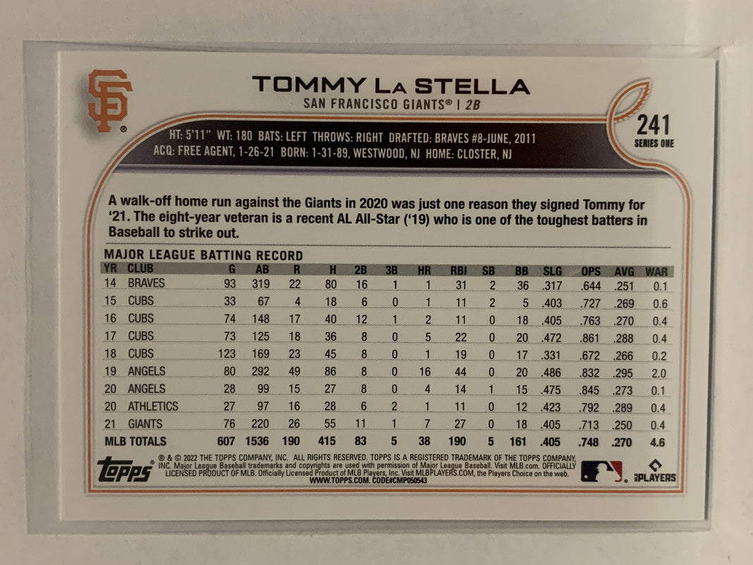 #241 Tommy La Stella San Francisco Giants 2022 Topps Series One Baseball Card MLB