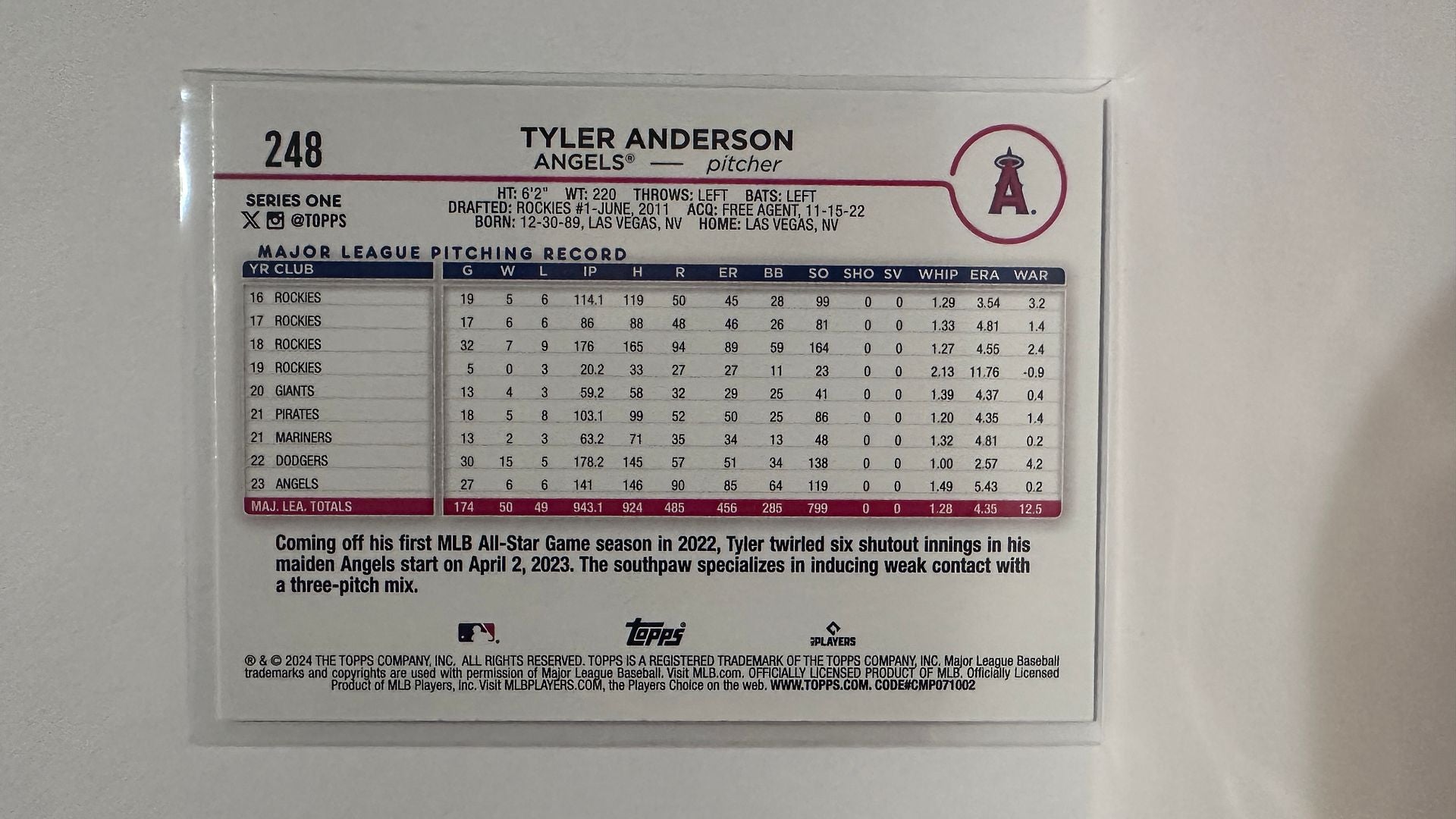 #248 Tyler Anderson Los Angeles Angels 2024 Topps Baseball Card
