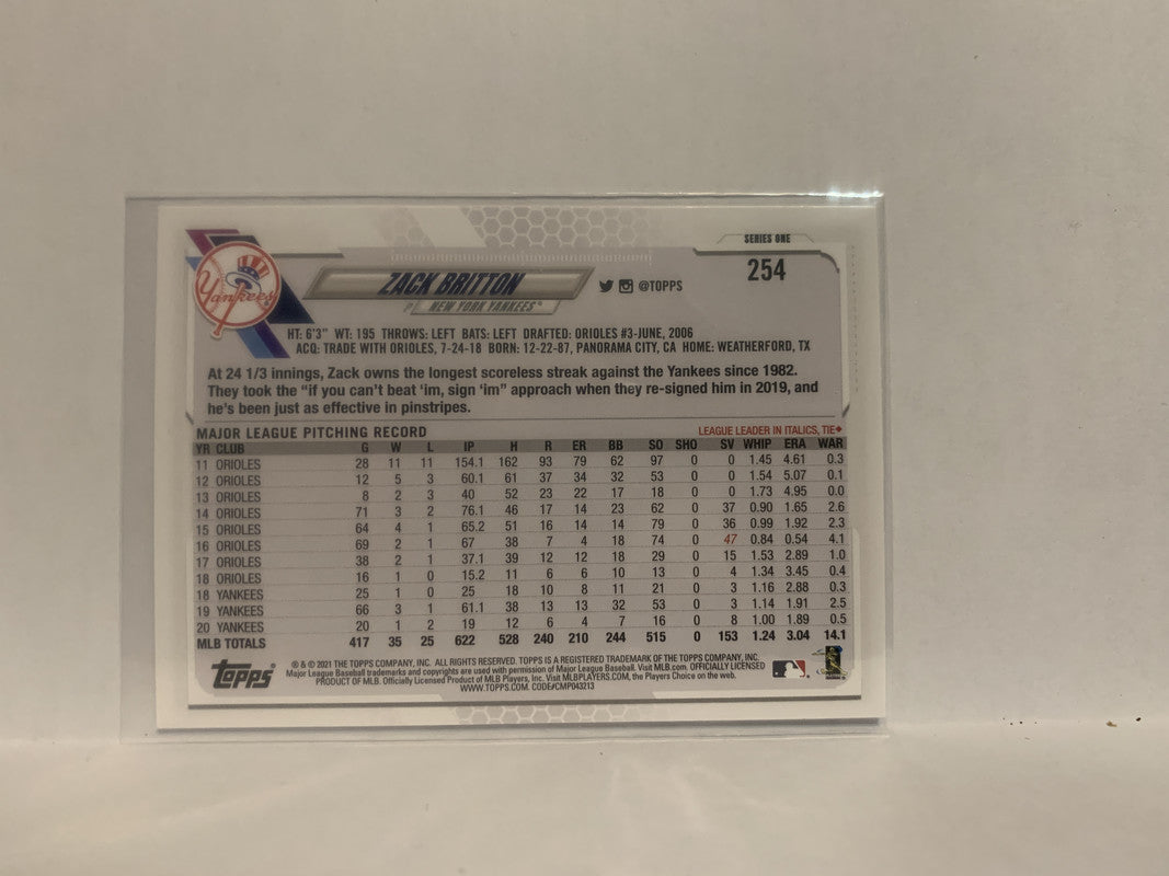 #254 Zack Britton New York Yankees 2021 Topps Series One Baseball Card