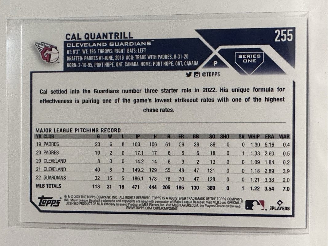 #255 Cal Quantrill Cleveland Guardians 2023 Topps Series One Baseball Card