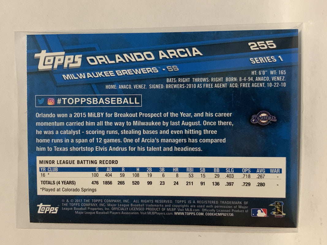 #255 Orlando Arcia Rookie Milwaukee Brewers 2017 Topps Series One Baseball Card