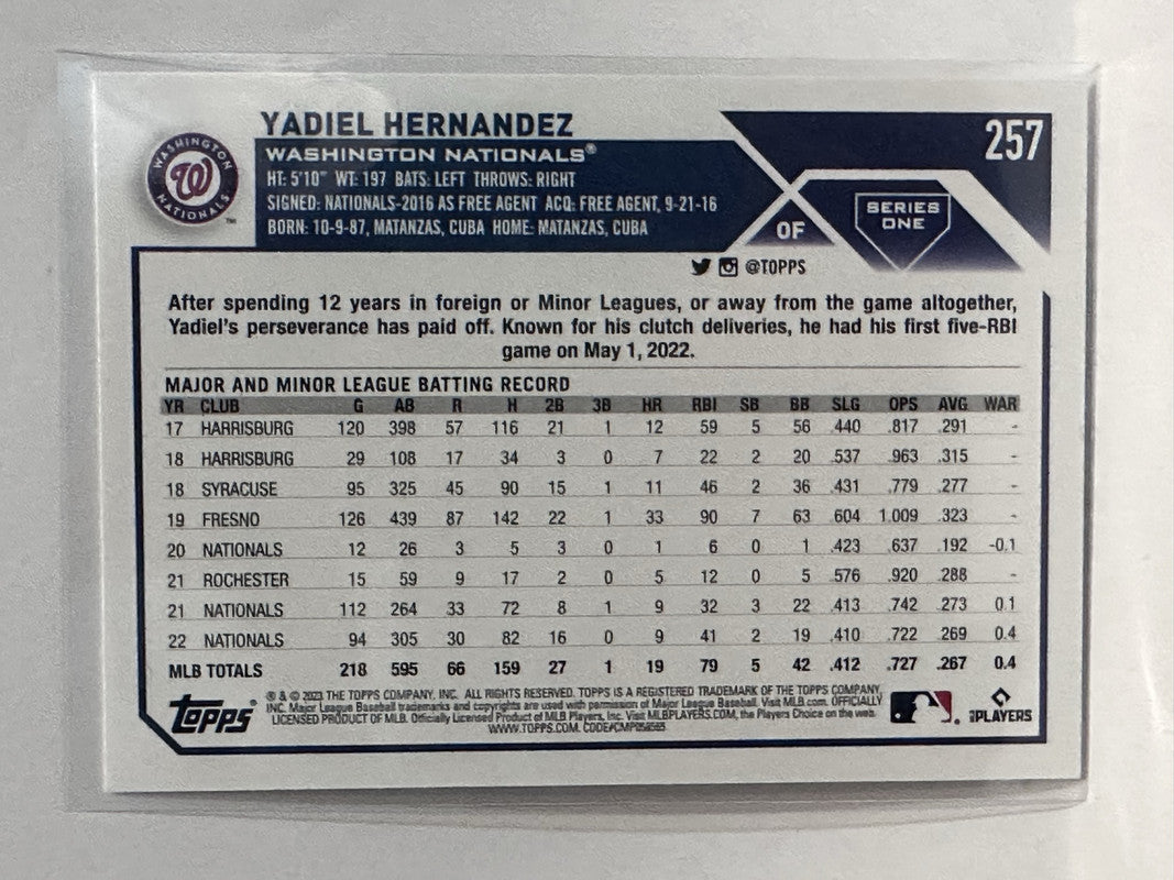#257 Yadiel Hernandez Washington Nationals 2023 Topps Series One Baseball Card