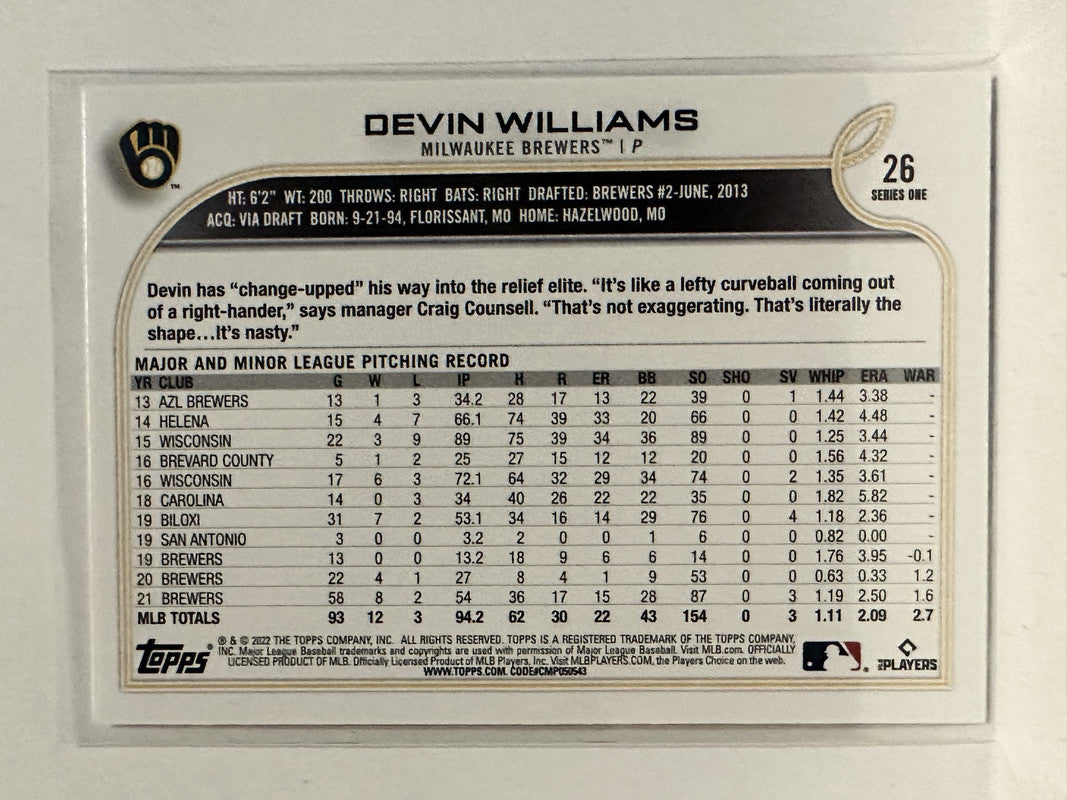 #26 Devin Williams Milwaukee Brewers 2022 Topps Series One Baseball Card