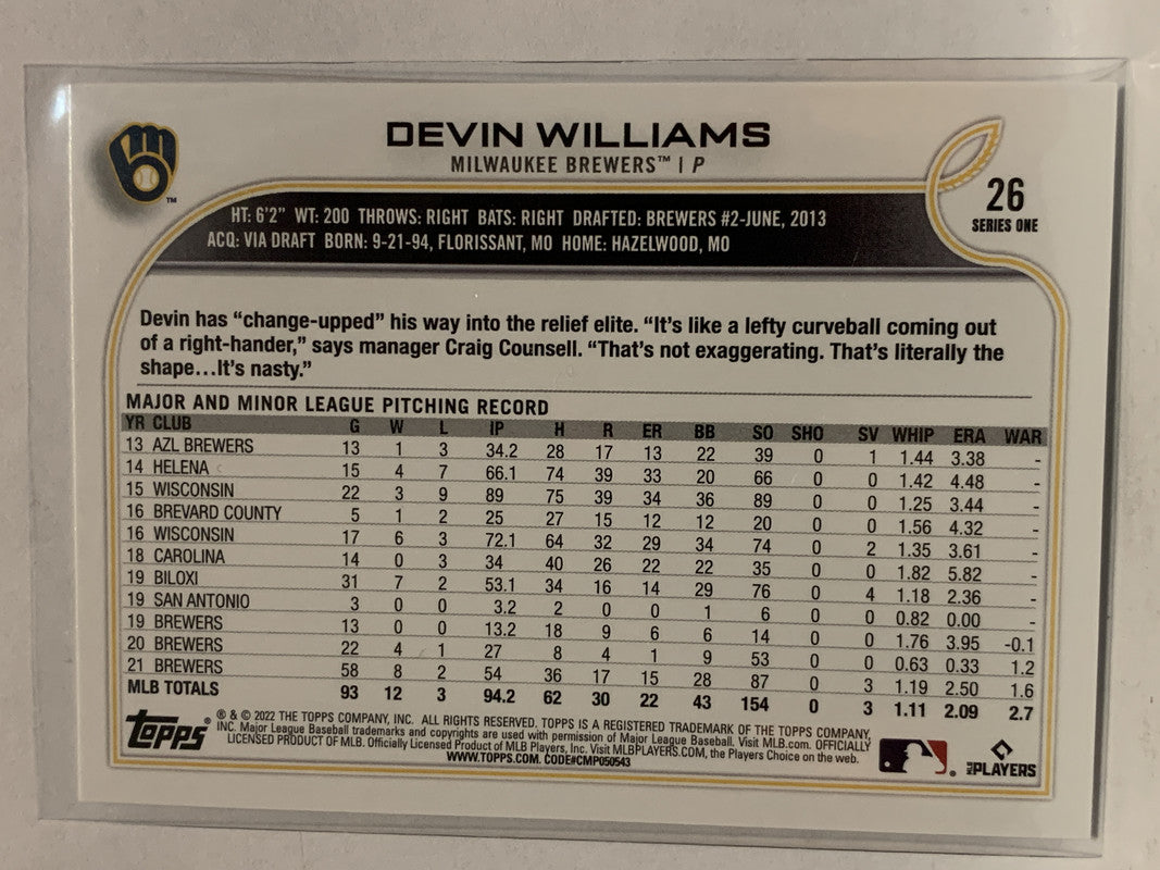 #26 Devin Williams Milwaukee Brewers 2022 Topps Series One Baseball Card MLB