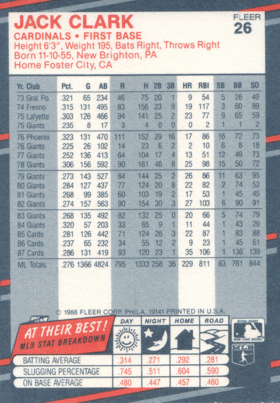 #26 Jack Clark St Louis Cardinals 1988 Fleer Baseball Card OE
