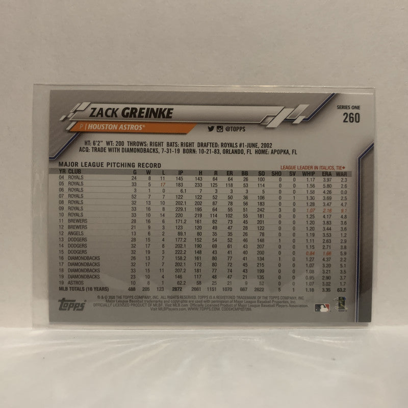 #260 Zack Greinke Houston Astros 2020 Topps Series One Baseball Card JC