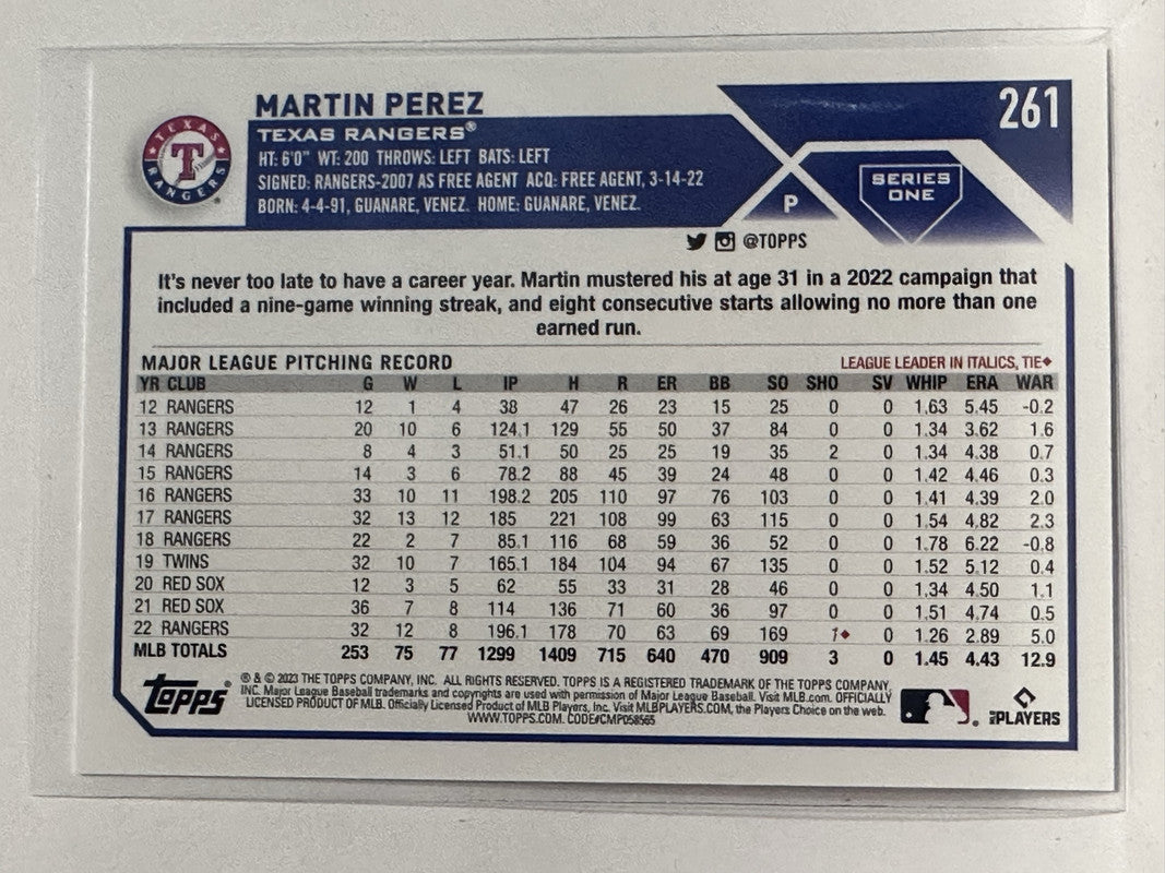 #261 Martin Perez Texas Rangers 2023 Topps Series One Baseball Card