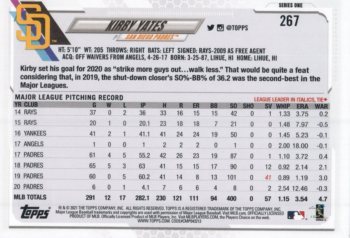 #267 Kirby Yates San Diego Padres 2021 Topps Series 1 Baseball Card