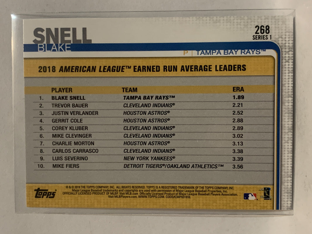 #268 Blake Snell League Leaders Tampa Bay Lightning 2019 Topps Series One Baseball Card