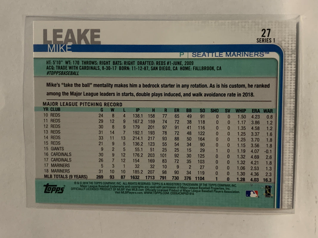 #27 Mike Leake Seattle Mariners 2019 Topps Series One Baseball Card