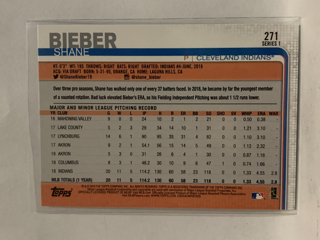 #271 Shane Bieber Future Stars Cleveland Indians 2019 Topps Series One Baseball Card