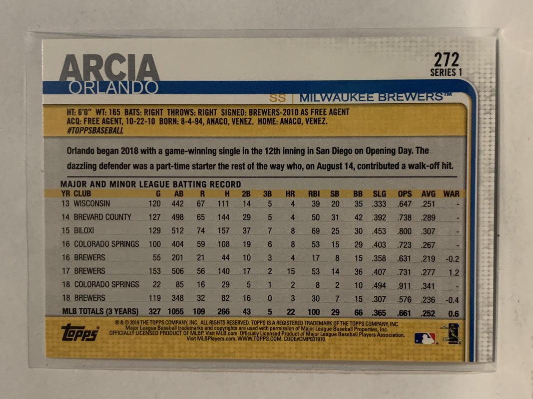 #272 Orlando Arica Milwaukee Brewers 2019 Topps Series One Baseball Card