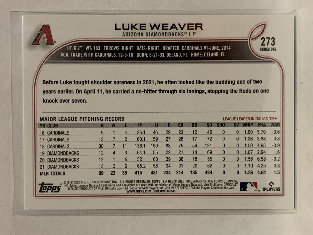 #273 Luke Weaver Arizona Diamondbacks 2022 Topps Series One Baseball Card MLB