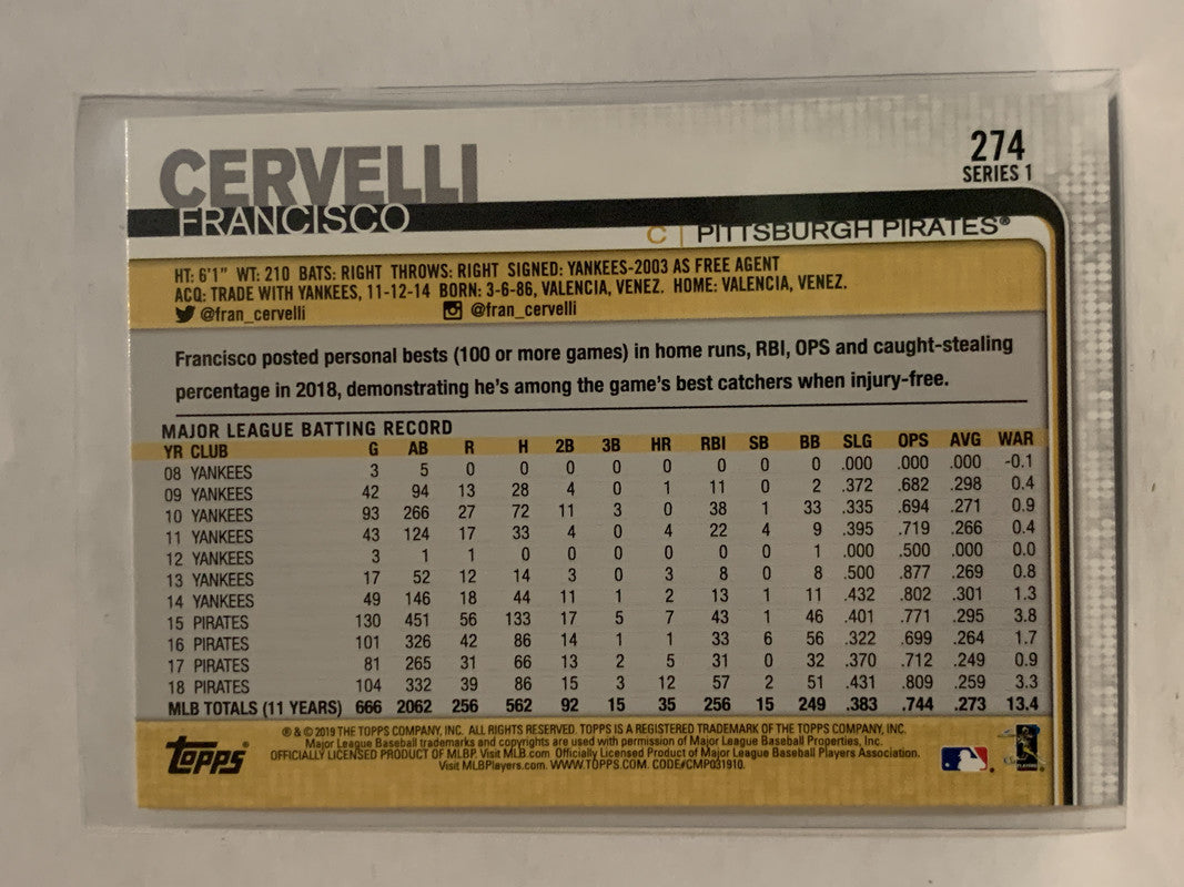 #274 Francisco Cervelli Pittsburgh Pirates 2019 Topps Series One Baseball Card