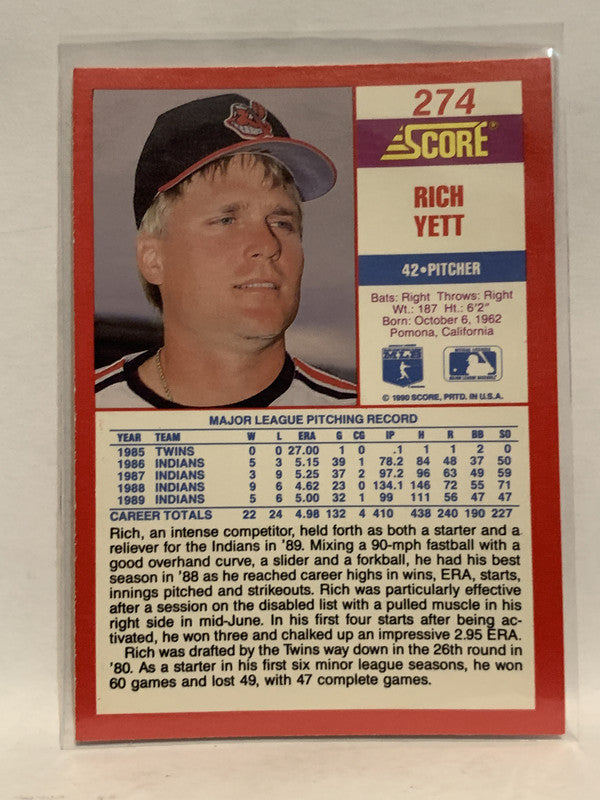 #274 Rich Yett Cleveland Indians 1990 Score Baseball Card