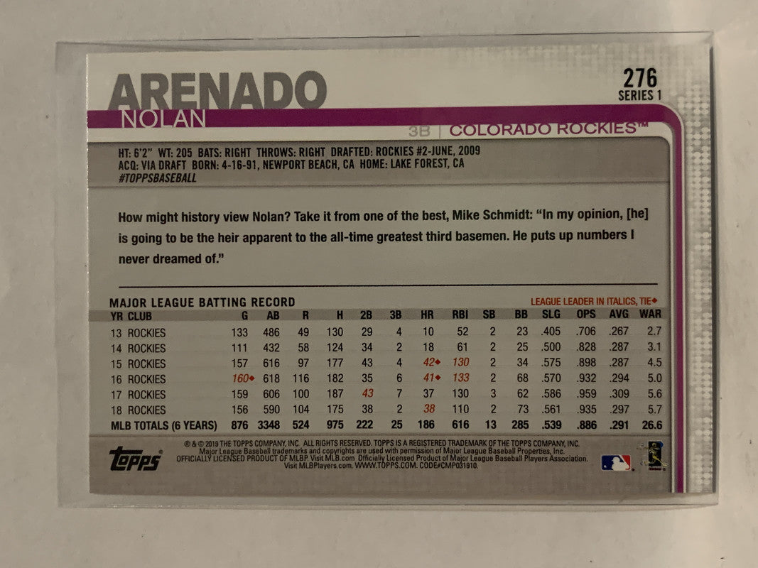 #276 Nolan Arenado Colorado Rockies 2019 Topps Series One Baseball Card