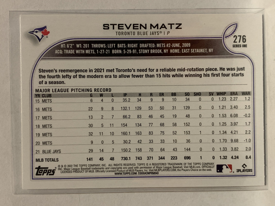 #276 Steven Matz Toronto Blue Jays 2022 Topps Series One Baseball Card MLB