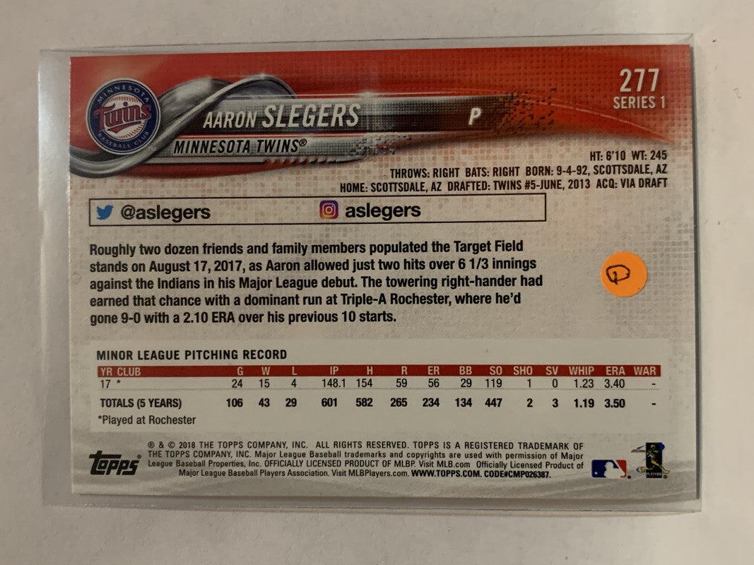 #277 Aaron Slegers Rookie Minnesota Twins 2018 Topps Series One Baseball Card MLB