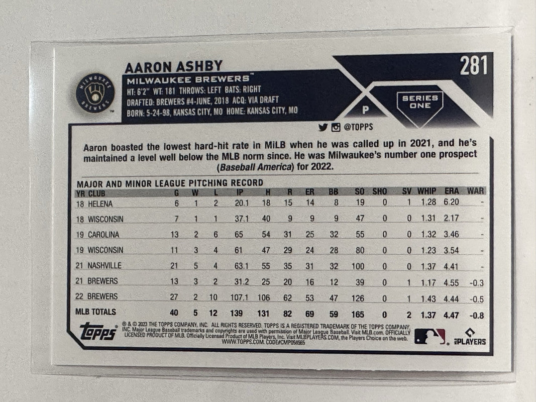 #281 Aaron Ashby Milwaukee Brewers 2023 Topps Series One Baseball Card