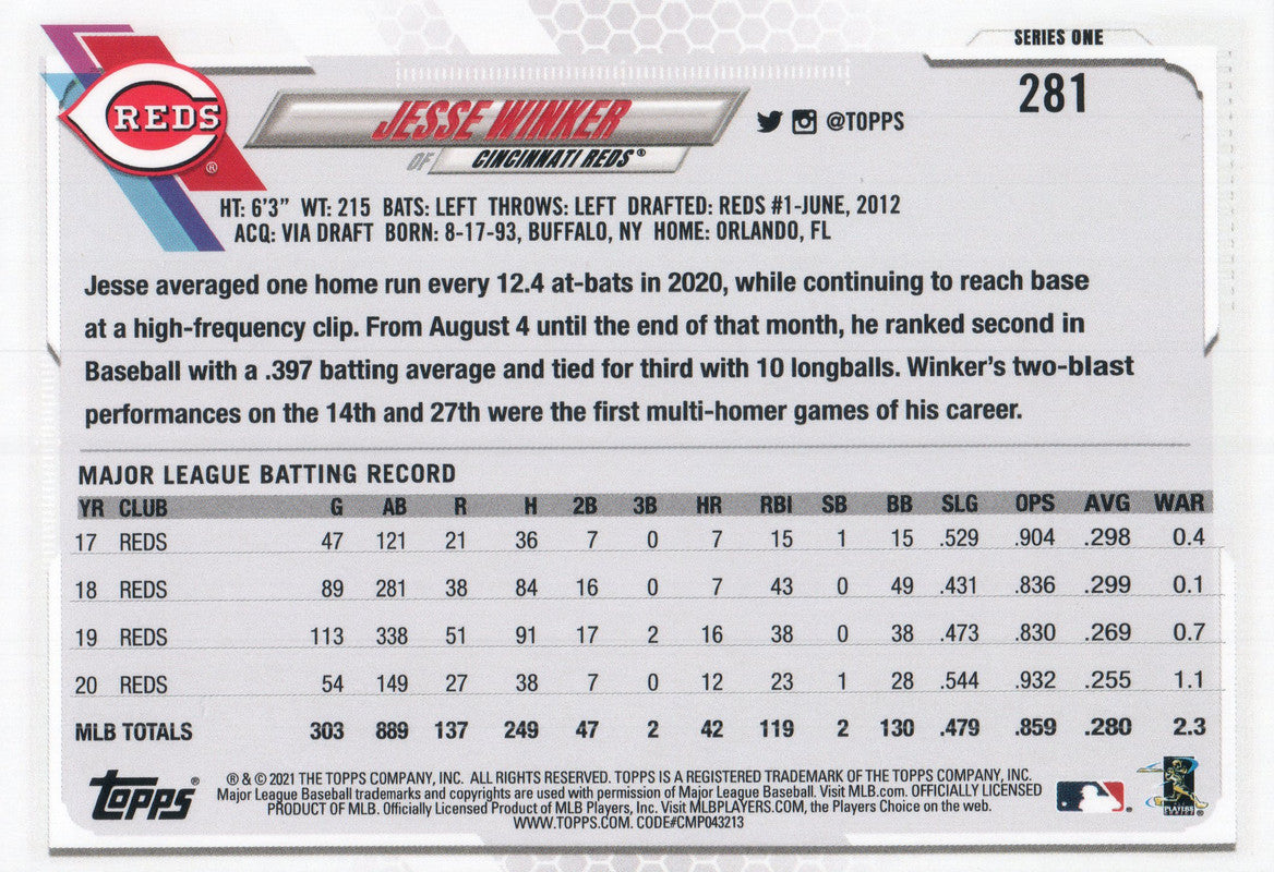#281 Jesse Winker Cinncinati Reds 2021 Topps Series 1 Baseball Card