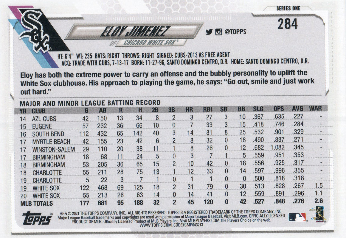 #284 Eloy Jimenez Chicago White Sox 2021 Topps Series 1 Baseball Card