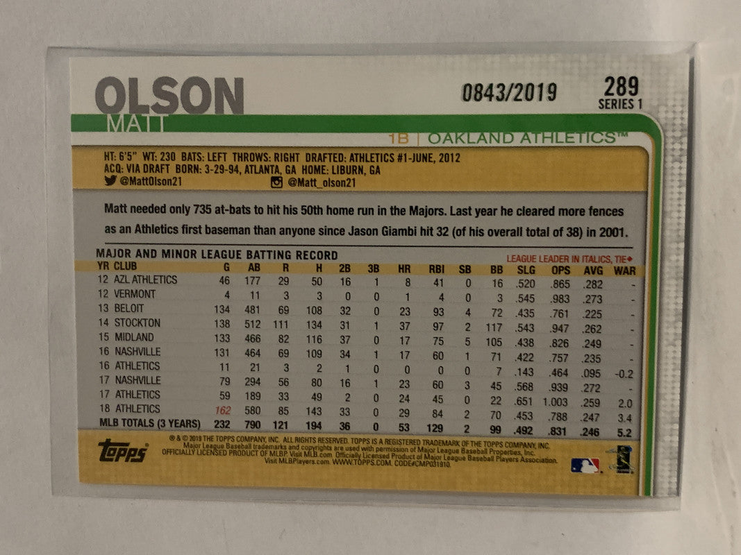 #289 Matt Olson 843/2019 Oakland Athletics 2019 Topps Series One Baseball Card