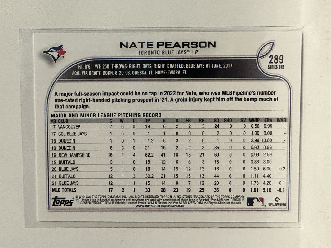 #289 Nate Pearson Toronto Blue Jays 2022 Topps Series One Baseball Card