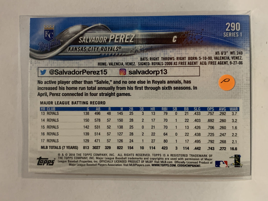 #290 Salvador Perez Kansas City Royals 2018 Topps Series One Baseball Card MLB