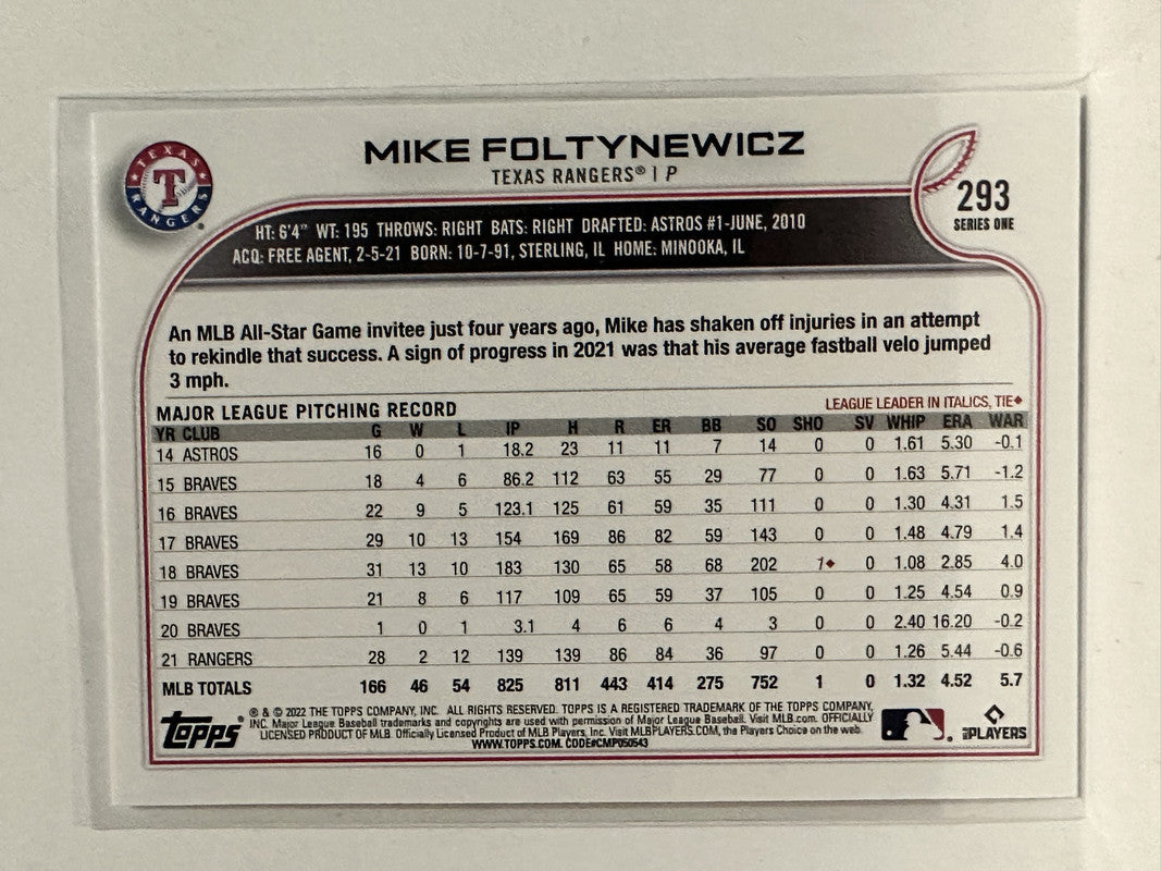 #293 Mike Foltynewicz Texas Rangers 2022 Topps Series One Baseball Card