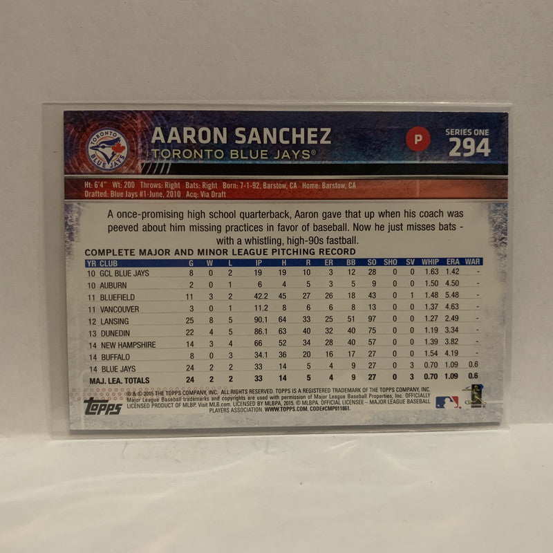 #294 Aaron Sanchez Future Stars Toronto Blue Jays 2015 Topps Series 1 Baseball Card I1