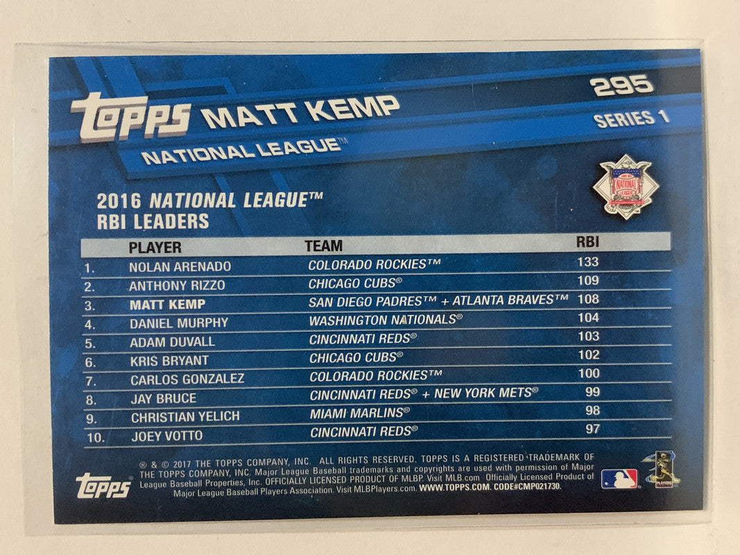 #295 Matt Kemp League Leaders San Diego Padres 2017 Topps Series One Baseball Card