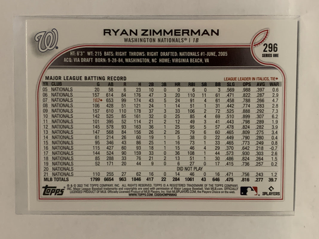 #296 Ryan Zimmerman Washington Nationals 2022 Topps Series One Baseball Card MLB