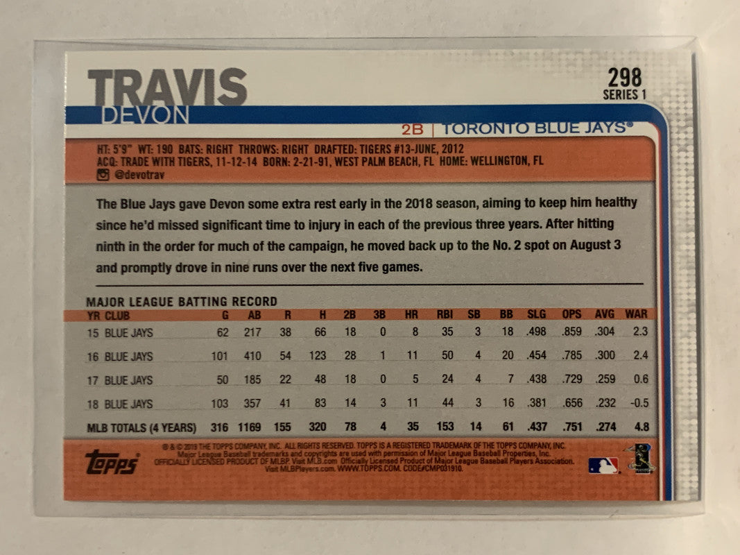 #298 Devon Travis Toronto Blue Jays 2019 Topps Series One Baseball Card
