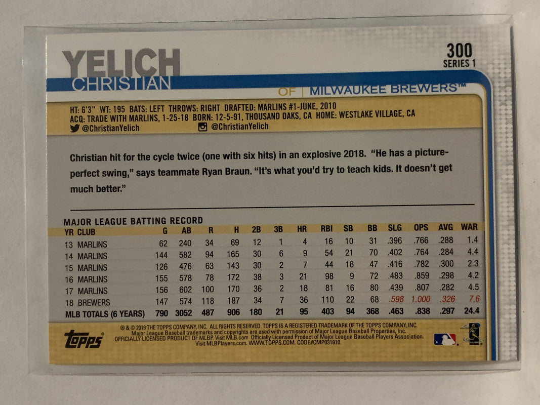 #300 Christian Yelich 150th Milwaukee Brewers 2019 Topps Series One Baseball Card