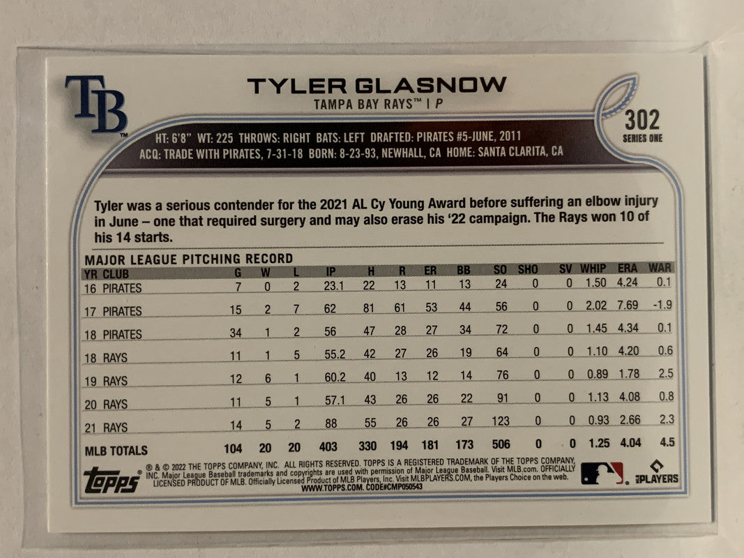 #302 Tyler Glasnow Tampa Bay Rays 2022 Topps Series One Baseball Card MLB