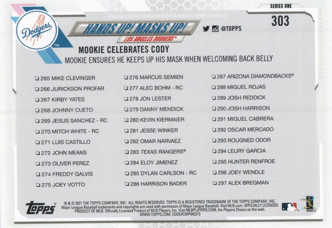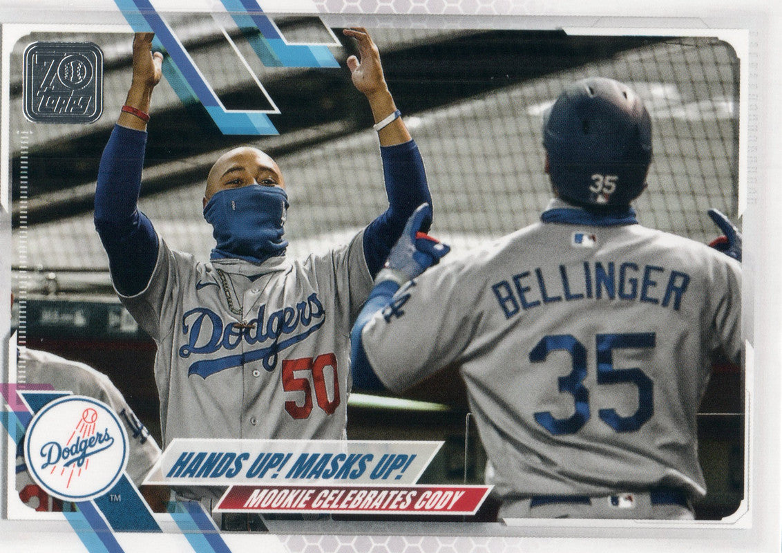 #303 Hands Up Masks Up Mookie Celebrates Cody Los Angeles Dodgers 2021 Topps Series 1 Baseball Card